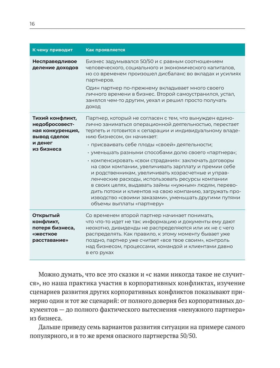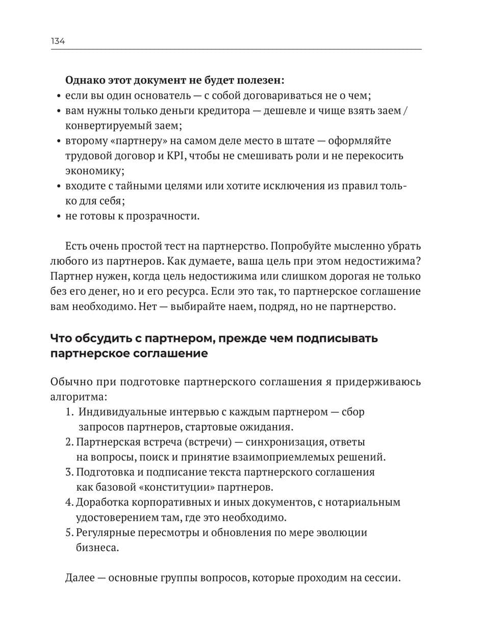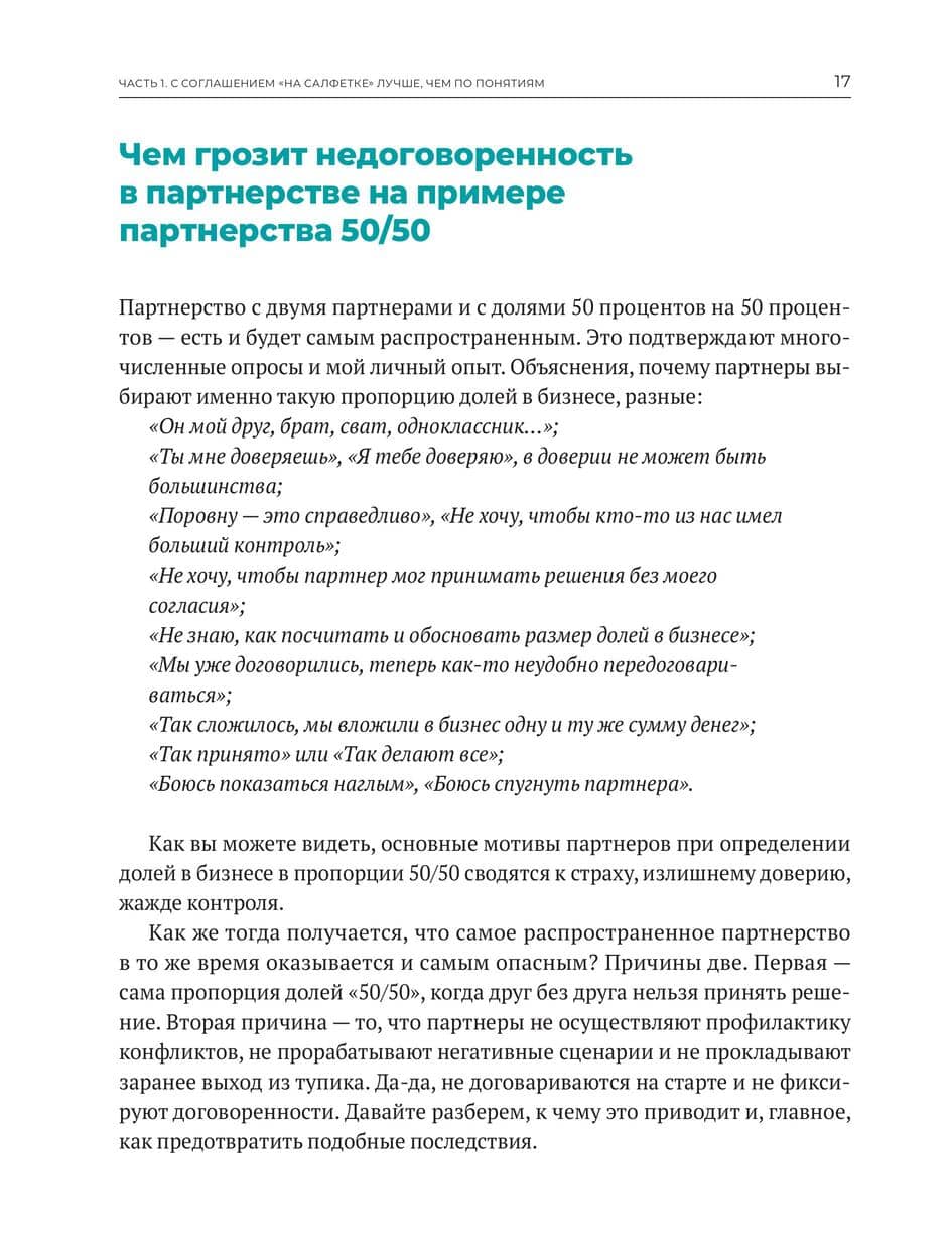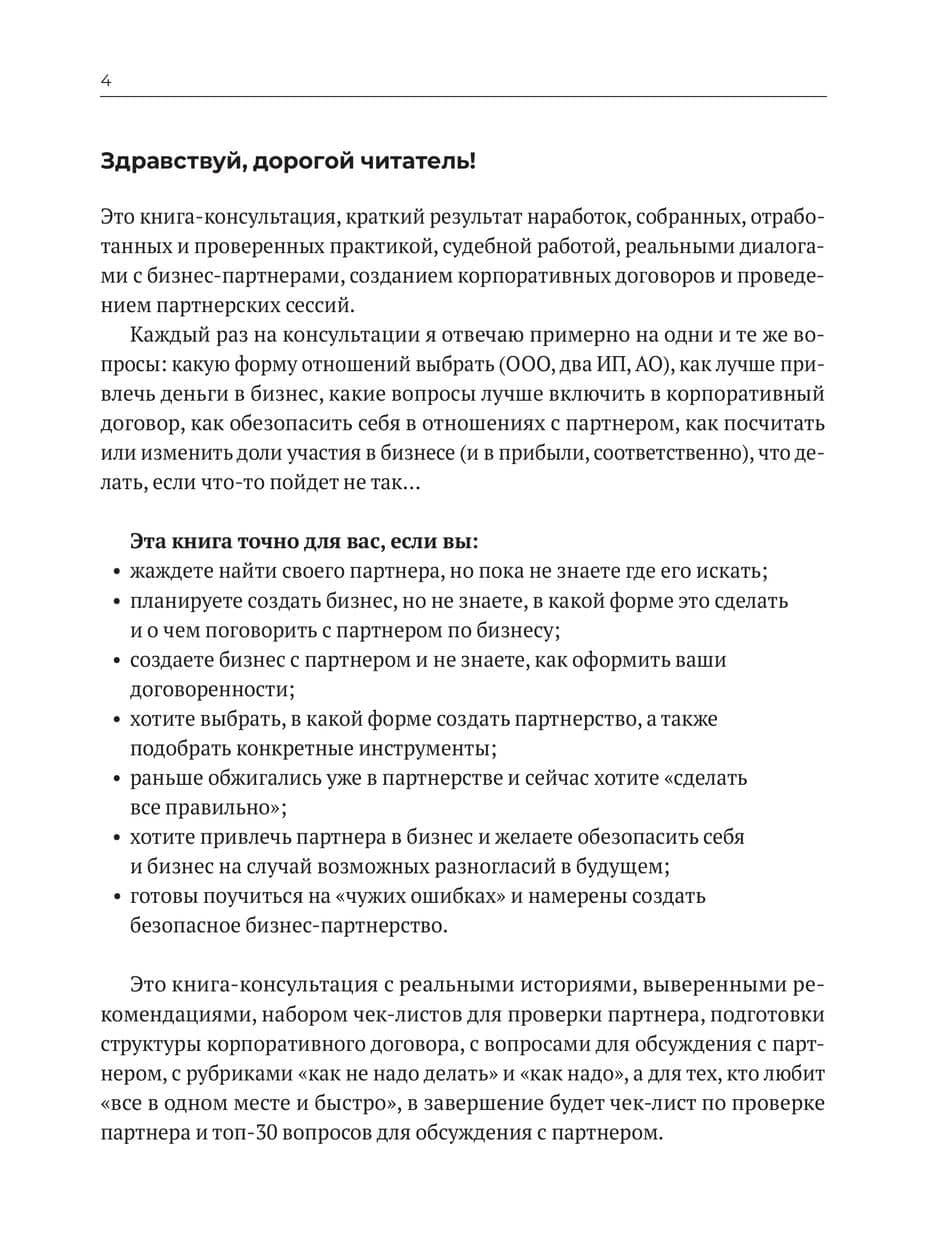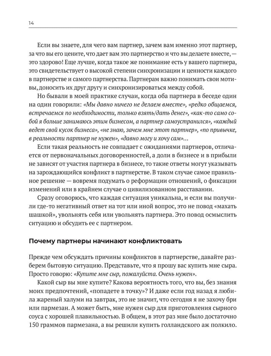 Эта книга - четкая карта маршрута от типичных конфликтов между совладельцами к безопасному бизнес-партнерству. Чек-листы и списки вопросов делают эту книгу рабочим инструментом: ее можно держать под рукой и реально использовать при работе над своим партнерством. Рекомендую всем, кто хочет строить долгосрочные отношения совладения бизнесом.
