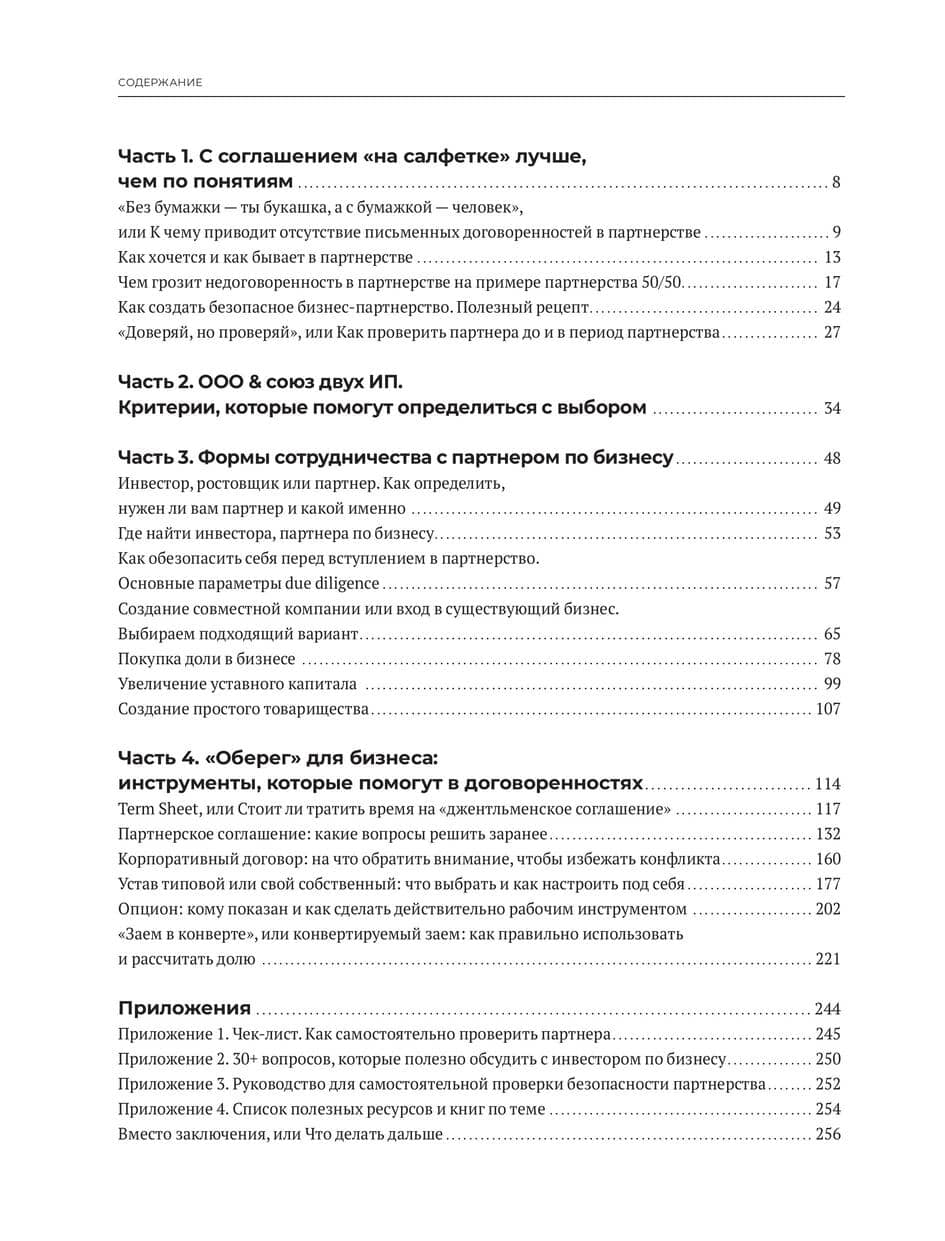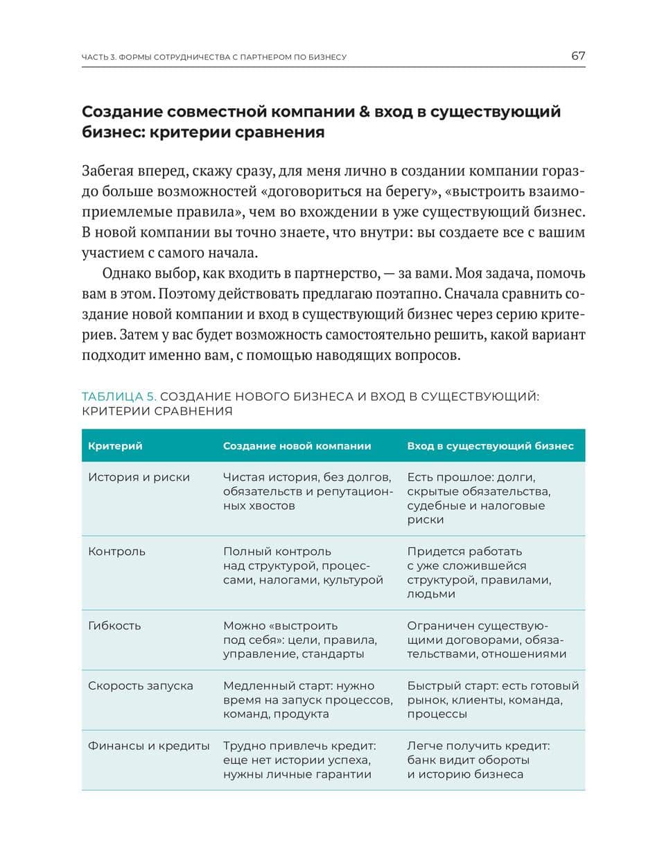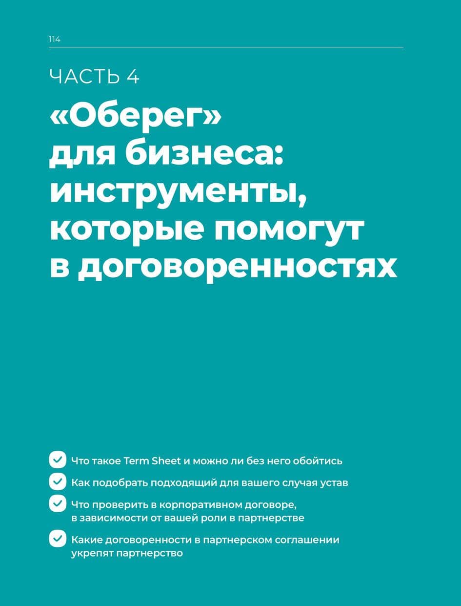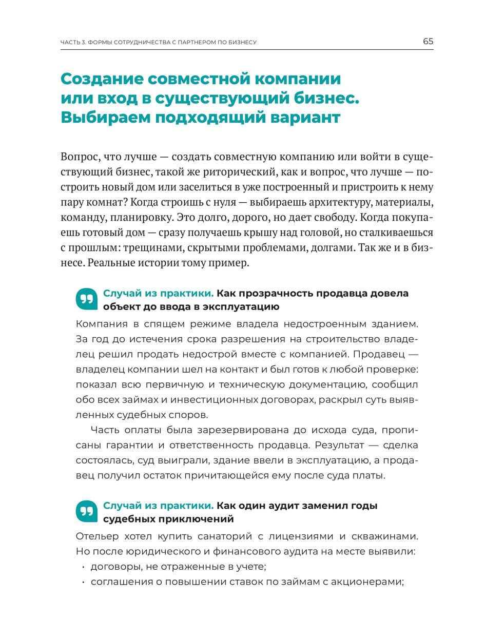 Эта книга - четкая карта маршрута от типичных конфликтов между совладельцами к безопасному бизнес-партнерству. Чек-листы и списки вопросов делают эту книгу рабочим инструментом: ее можно держать под рукой и реально использовать при работе над своим партнерством. Рекомендую всем, кто хочет строить долгосрочные отношения совладения бизнесом.