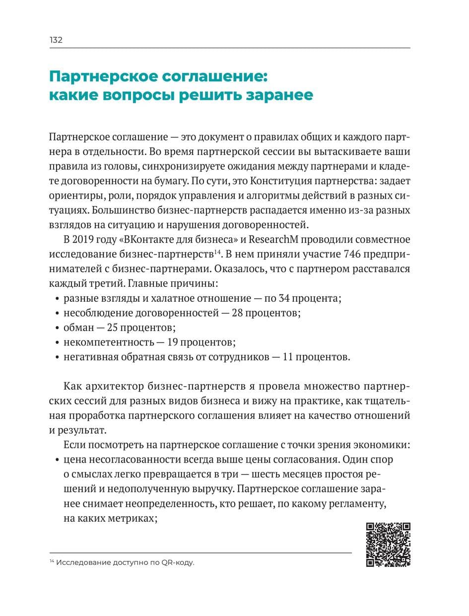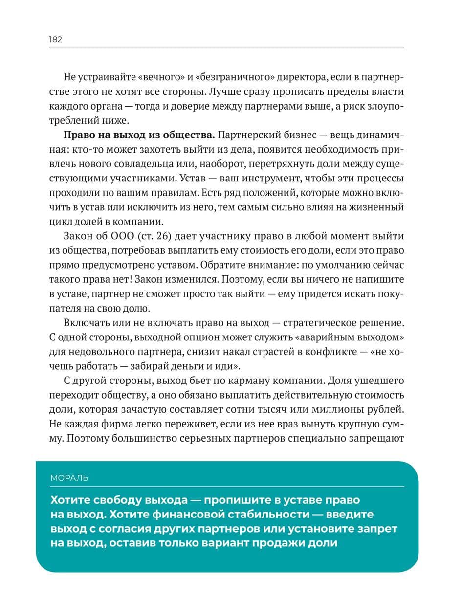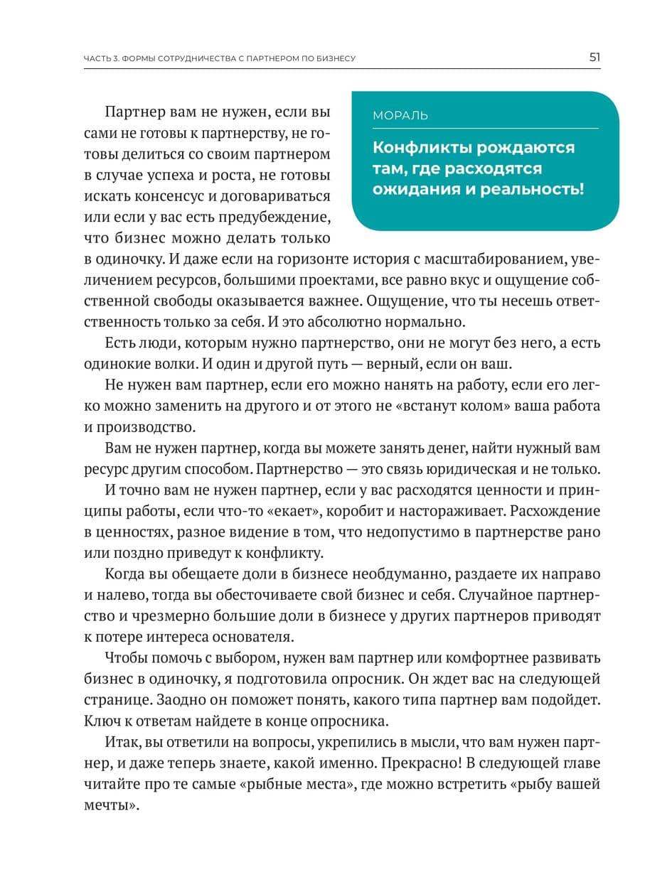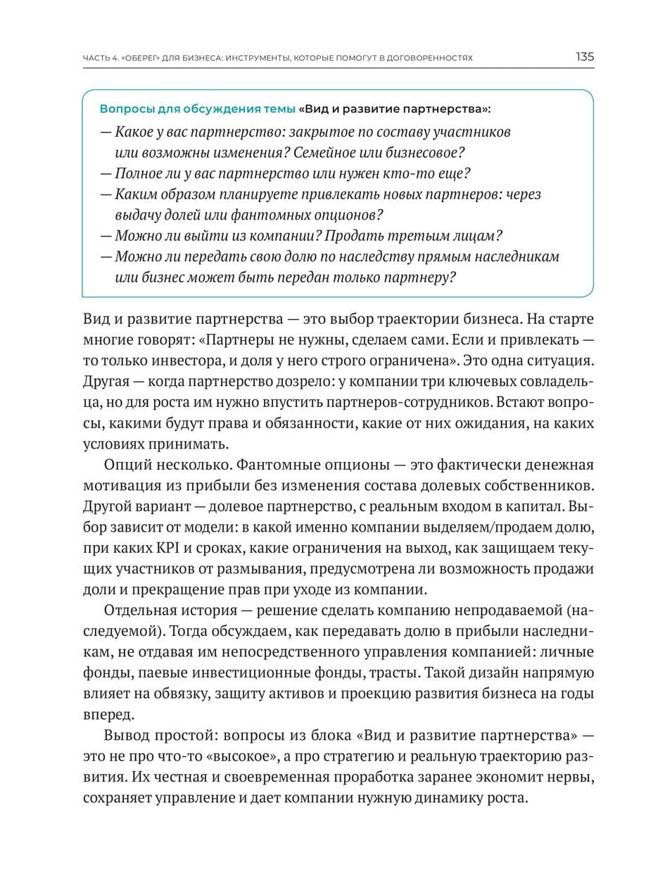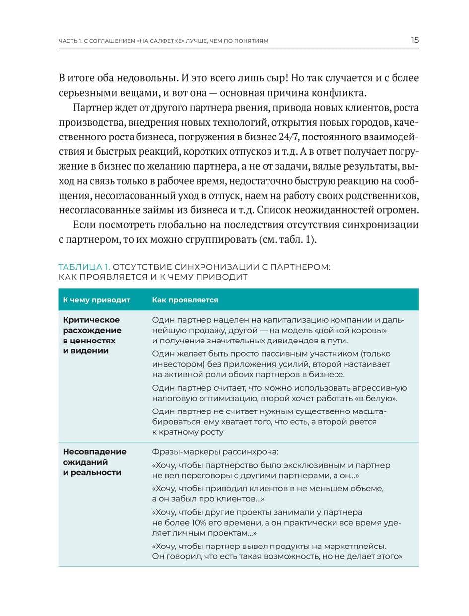 Эта книга - четкая карта маршрута от типичных конфликтов между совладельцами к безопасному бизнес-партнерству. Чек-листы и списки вопросов делают эту книгу рабочим инструментом: ее можно держать под рукой и реально использовать при работе над своим партнерством. Рекомендую всем, кто хочет строить долгосрочные отношения совладения бизнесом.