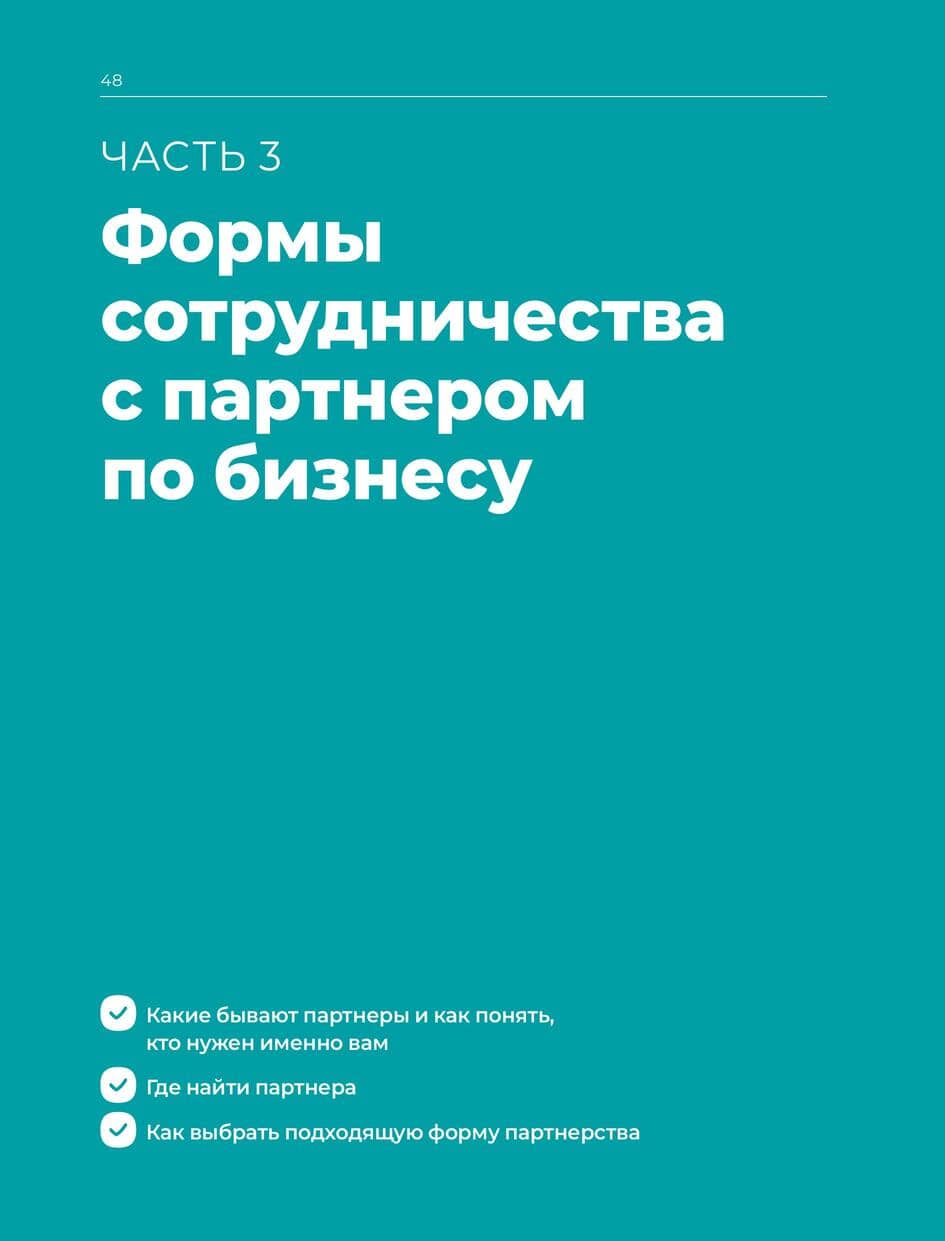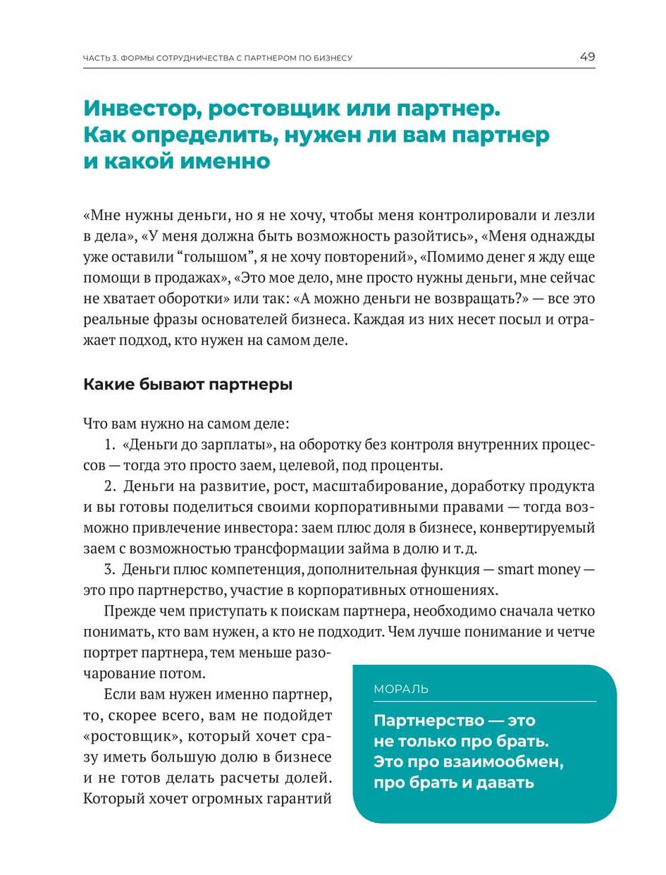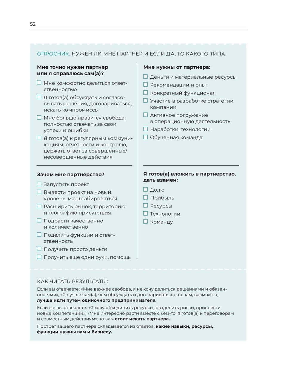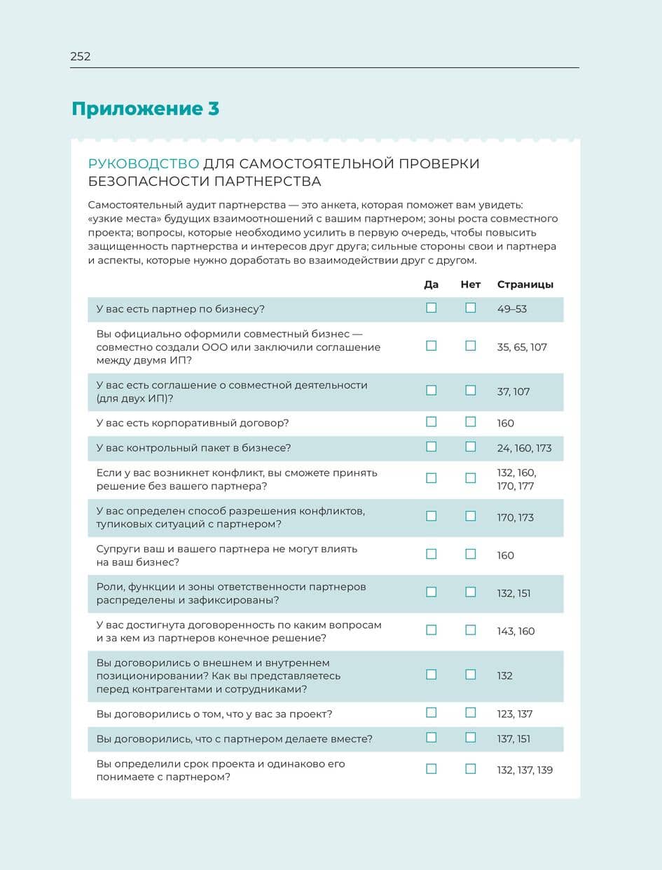 Эта книга - четкая карта маршрута от типичных конфликтов между совладельцами к безопасному бизнес-партнерству. Чек-листы и списки вопросов делают эту книгу рабочим инструментом: ее можно держать под рукой и реально использовать при работе над своим партнерством. Рекомендую всем, кто хочет строить долгосрочные отношения совладения бизнесом.